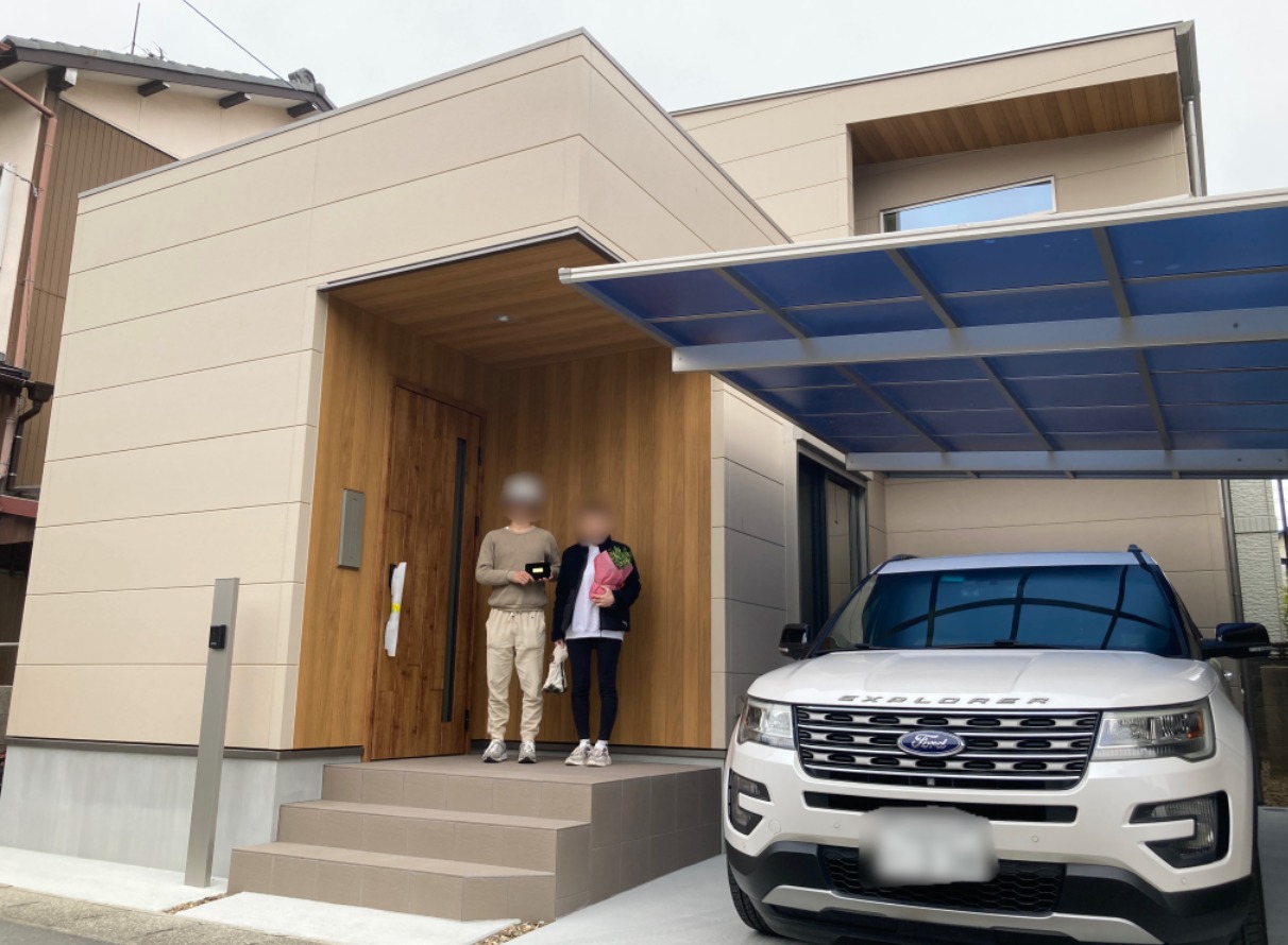 お車を駐車場に入れられ、お家の前で記念写真を撮影。