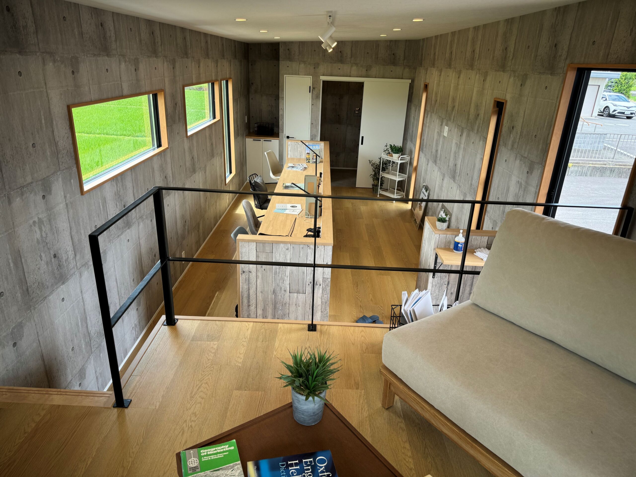 弊社、蟹江のトレーラーハウスでつくった事務所のデザインを気に入っていただき、同じような横並びのデスクを設けています!