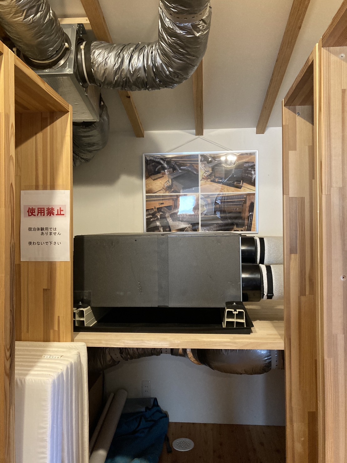 天井裏に下記の写真のようなパッシブエアコン室内ユニットを設置し、各部屋、1Fにダクトを使って暖かい空気・冷たい空気を循環させます。