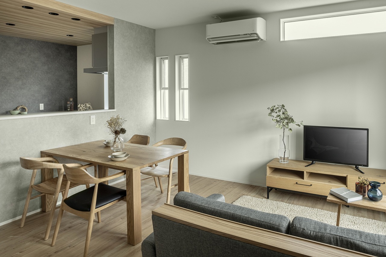 内装は柔らかい木目のフロアにアクセントでグレーベースの石目調を合わせました。