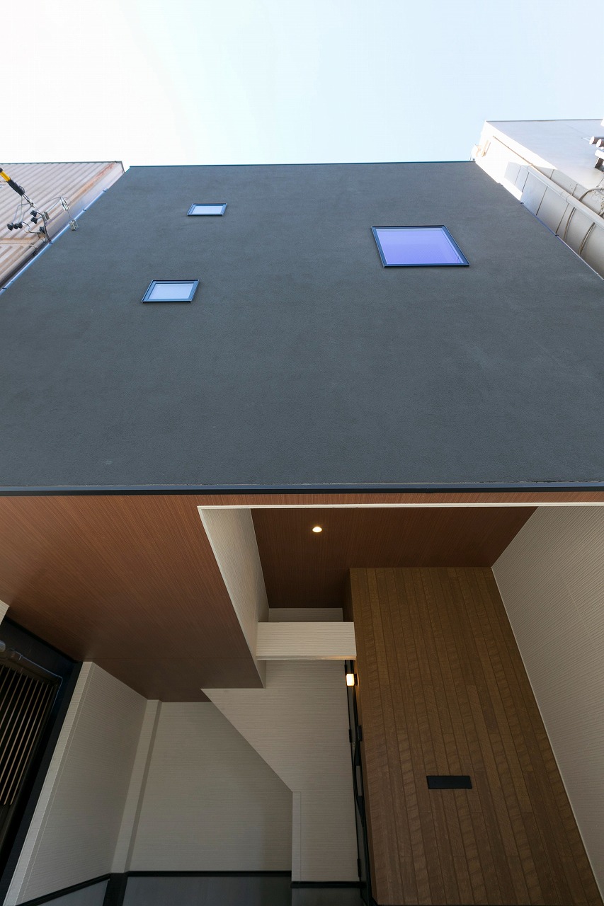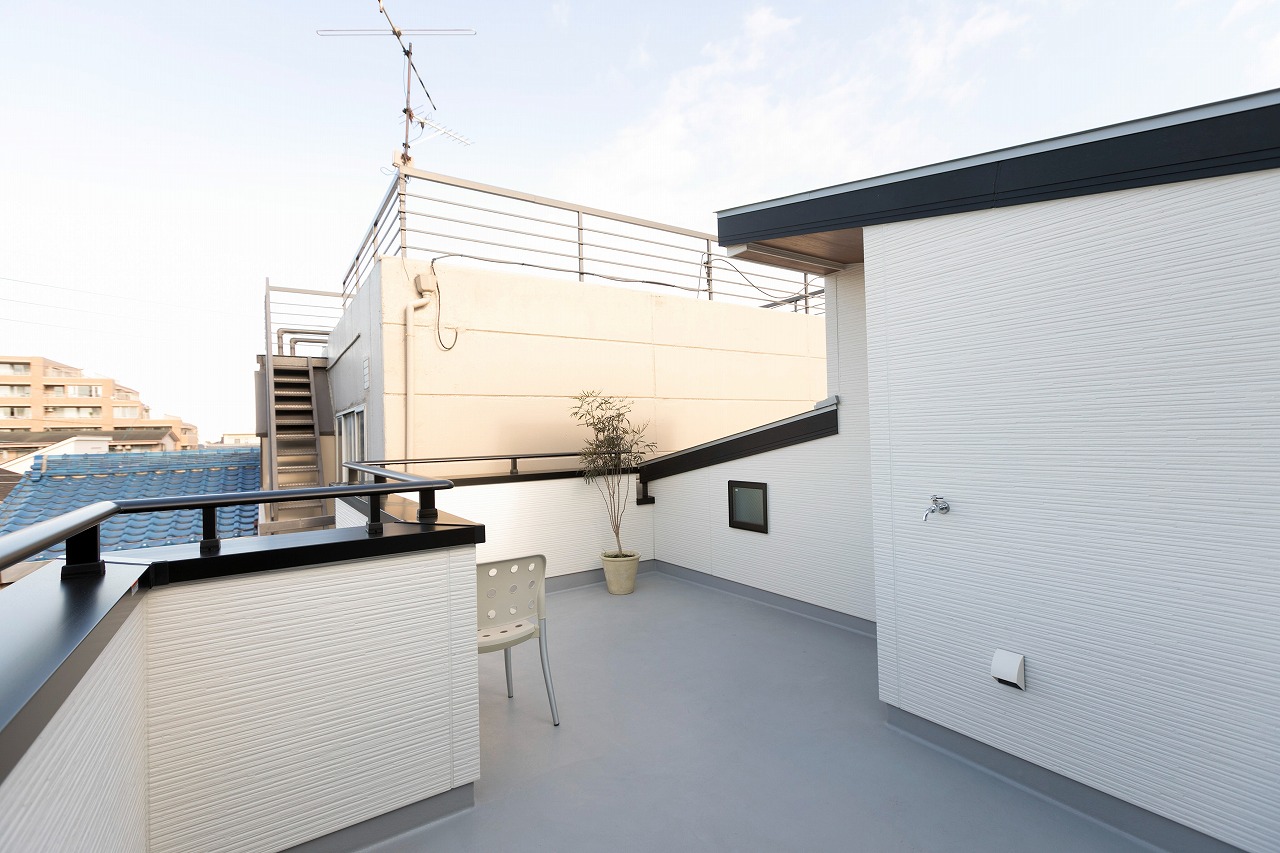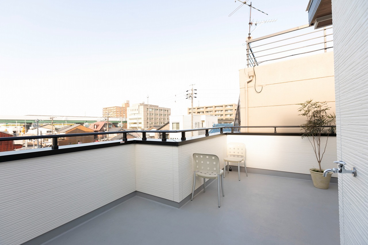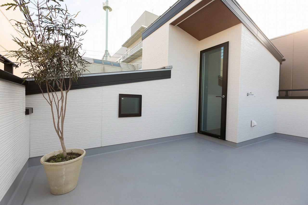 分譲住宅 開放感あるコンパクトな住まい 南区柵下分譲住宅 Exterior ドイツStoの塗壁を正面壁に採用。軒天から入り口付近には木目調サイディングで色柄をプラス。正面から見た壁にスクエア窓をデザイン的に配置。 Rooftop 狭小地に建つ家の屋上には広々とした屋上バルコニー Living & Dining 狭小地を感じさせない16畳ほどのLDK Kitchen 吹き抜けのリビングダイニングで光を取り入れます Entrance Bed Room Loft 一覧へ 前へ 次へ