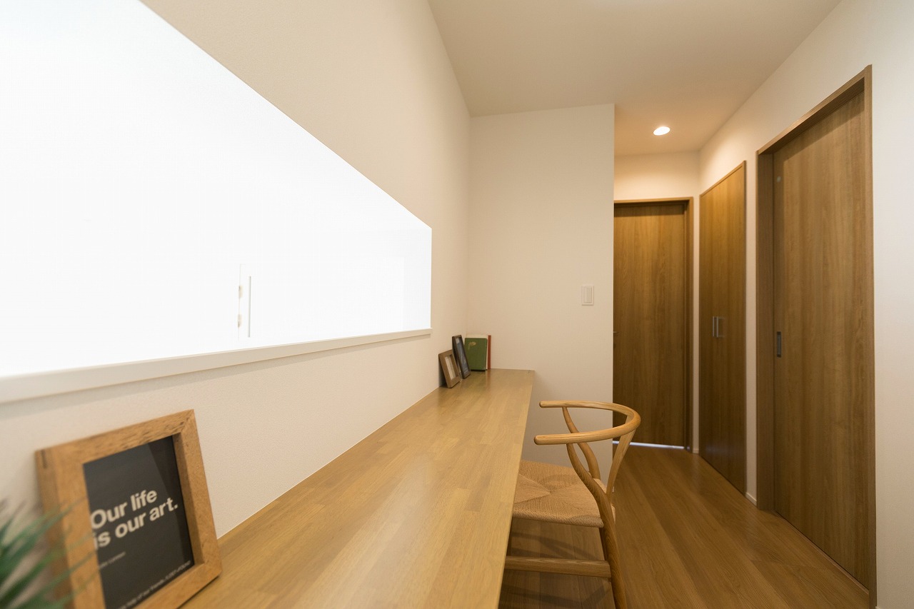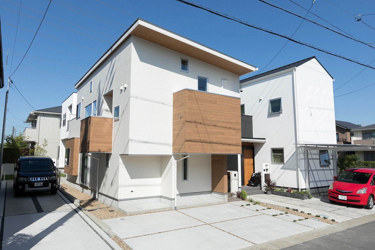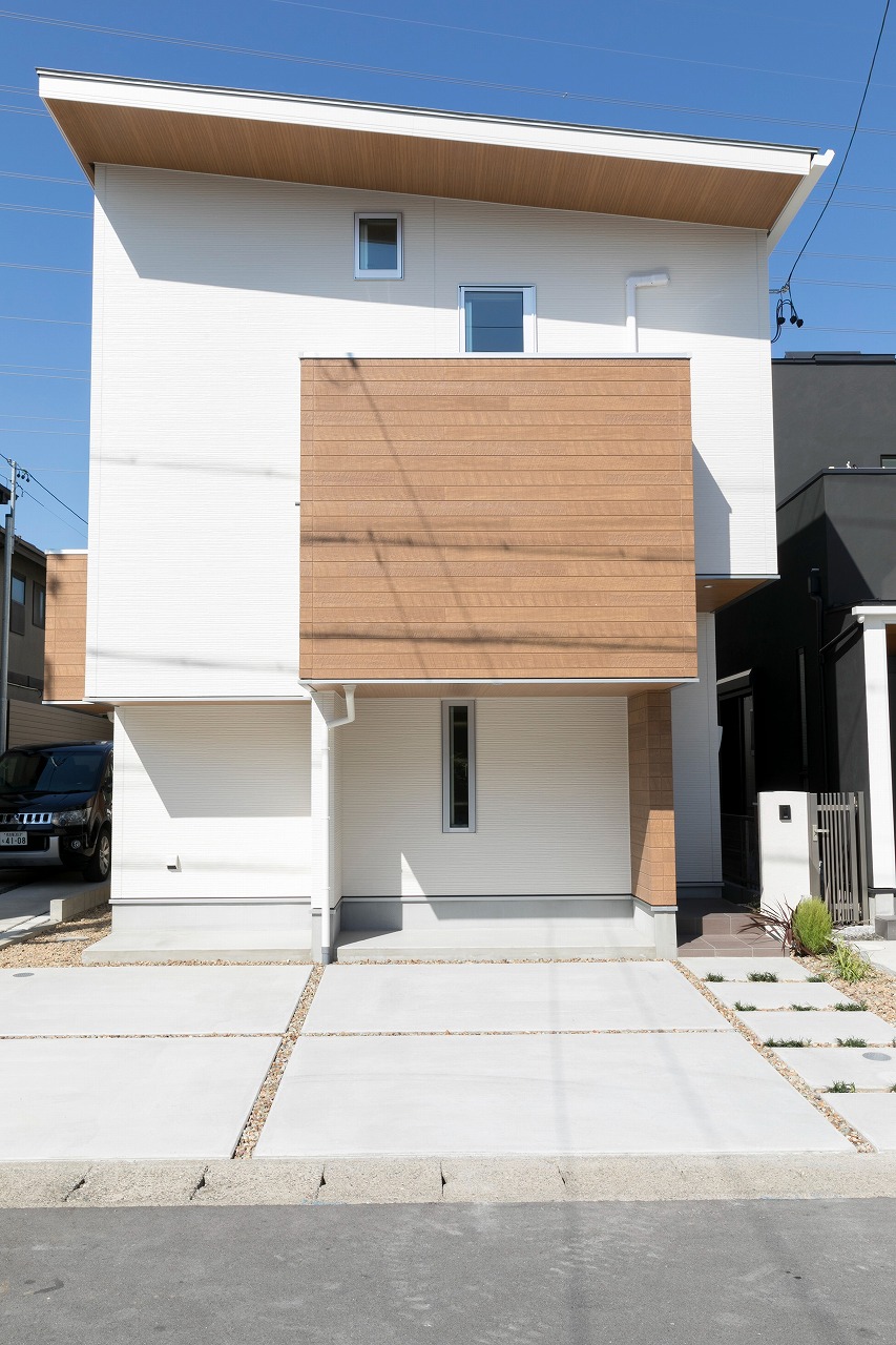 分譲住宅 吹き抜けを覗きこめるカウンターのある家 蟹江町学戸分譲住宅 Exterior 柔らかい雰囲気をイメージさせる白と木目調のサイディングを使用見上げる軒天やバルコニー下部にも木目調を取り入れ、統一感を持たせるようサッシ色はシルバーを使用 Living 吹き抜けから見えるLDKは窓を南側に明るさ抜群 Hall & Counter 吹き抜けに面した廊下部にはファミリーカウンター Japanese Room 約4.5帖の和室にも光が入るように木製ではなくアルミ建具を使用 Entrance Loft Walk-in Closet 一覧へ 前へ 次へ