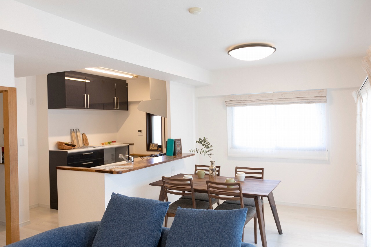 キッチンや建具は濃いめの色味でしめてメリハリをだしました。