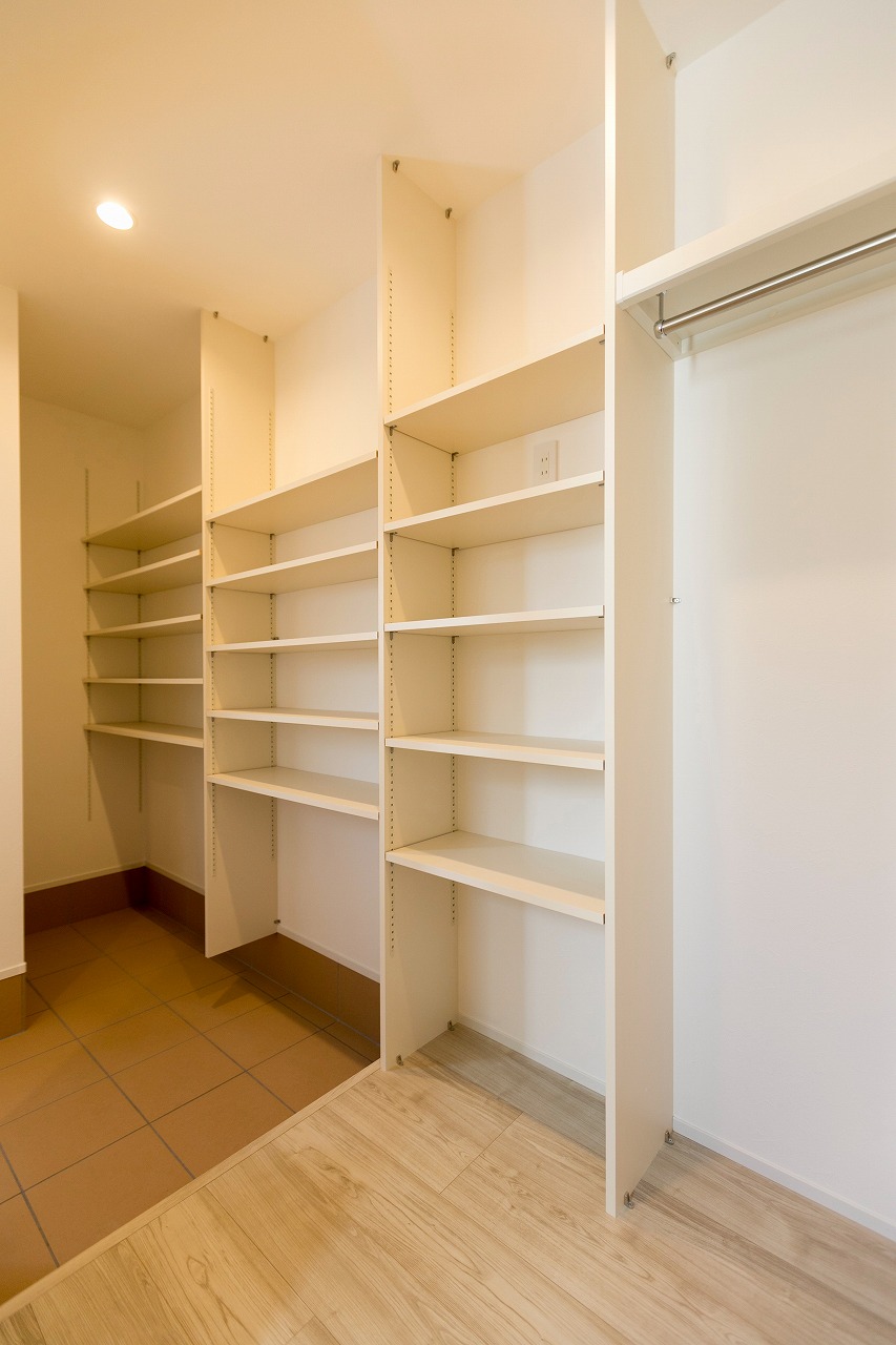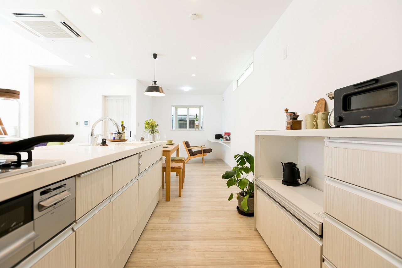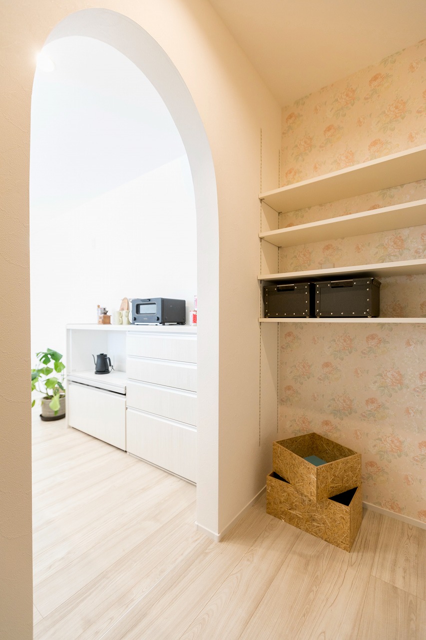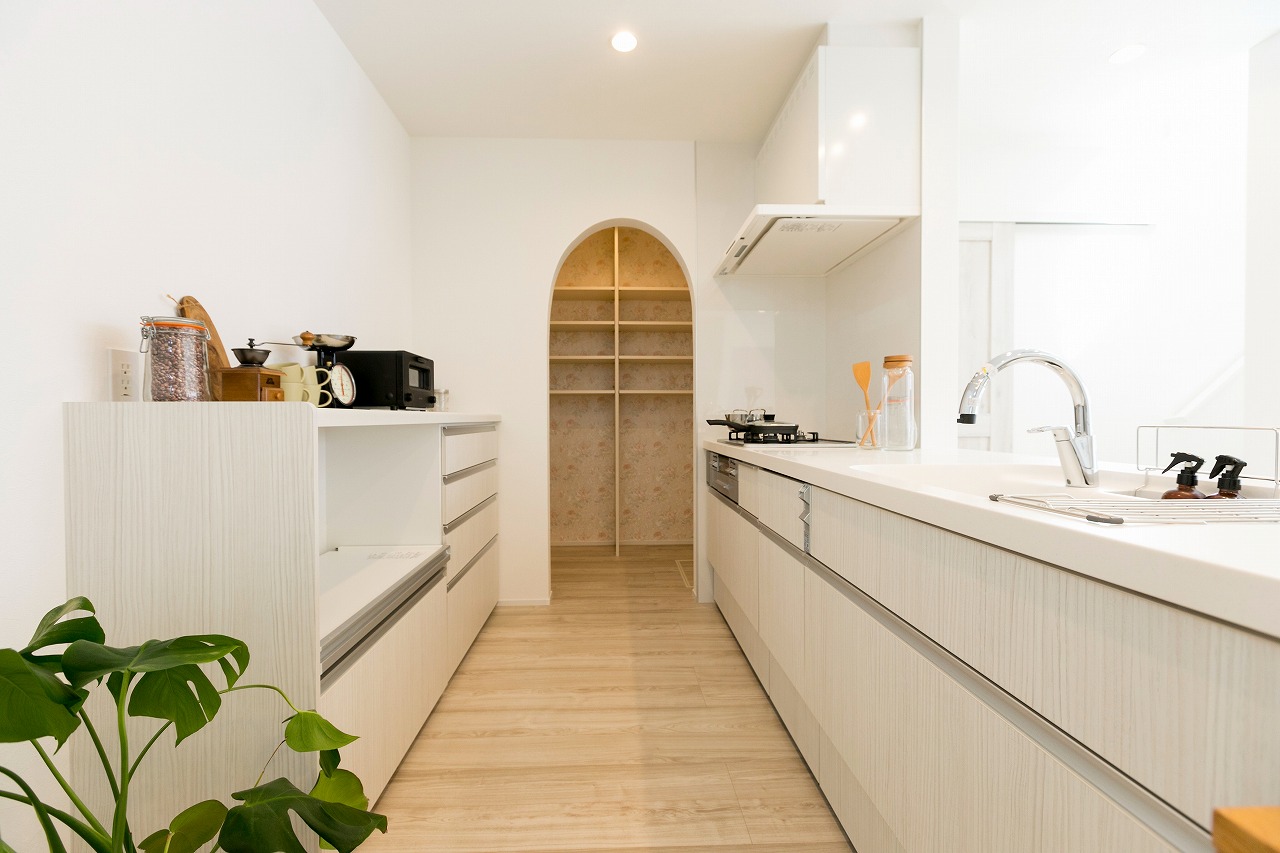 ホワイトでまとめたキッチンにパントリーのアーチ壁