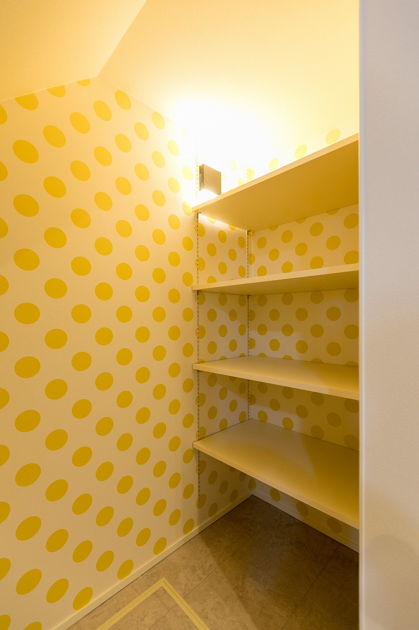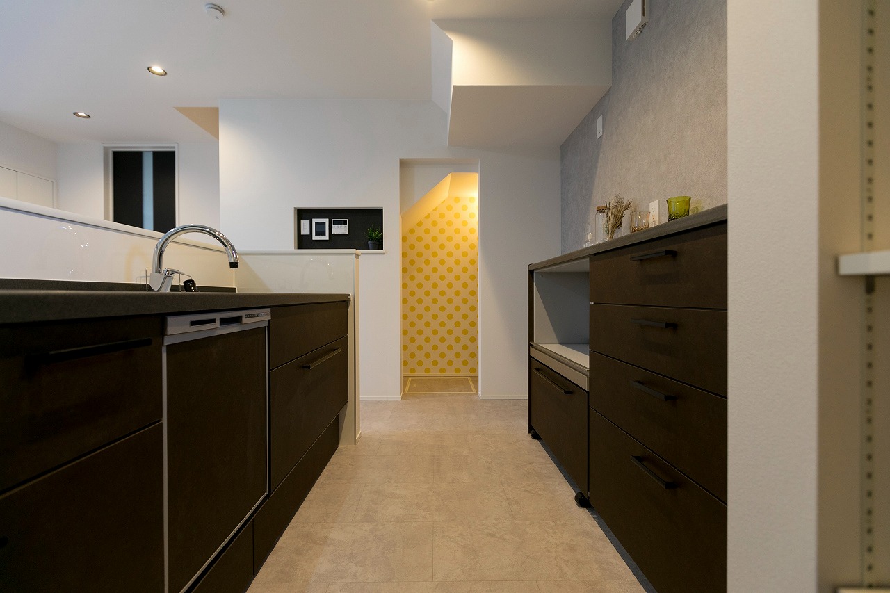 モノトーンでまとめたキッチンの奥はドットクロスがチラ見えするパントリー
