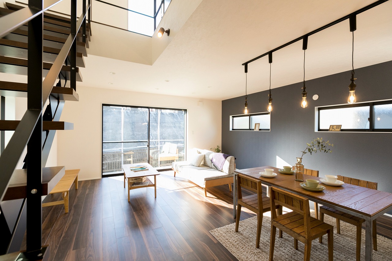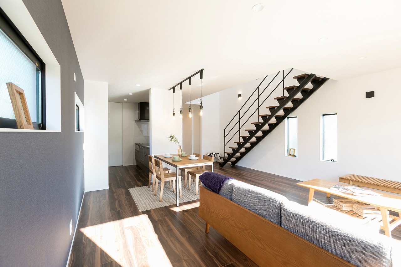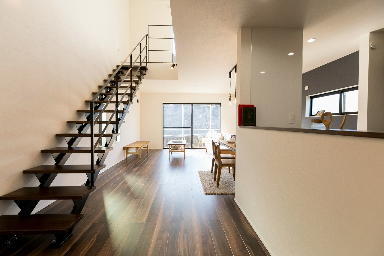 注文住宅 アイアン手すりのストリップ階段で実現、抜け感リビングの家 南区Y様邸 Exterior Living & Dining Kitchen Japanese Room Walk-in Closet 一覧へ 前へ 次へ