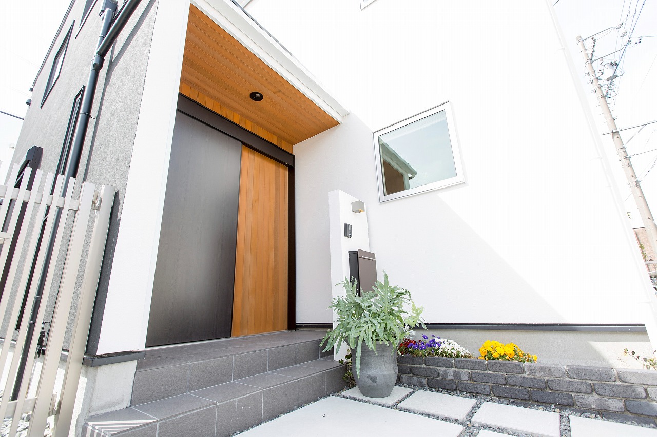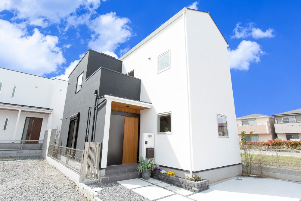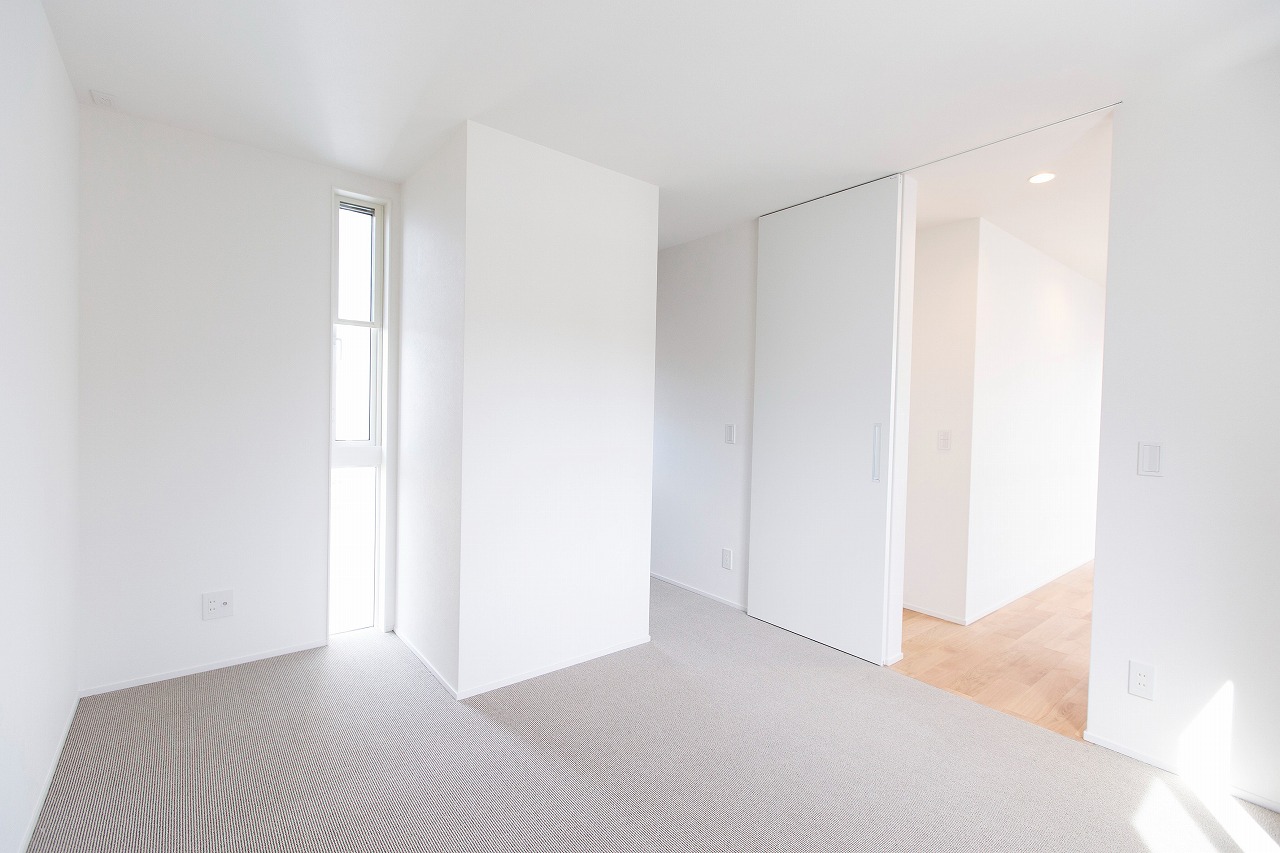 注文住宅 切妻屋根が特徴的なCasa 蟹江町T様邸 Exterior 切妻屋根の軒を出さずに家の形を表現。白と黒の外壁はドイツ製Stoを使用。玄関正面の板はレッドシダーを縦張りに。 Bed Room Walk-in Closet 建具を付けずにオープンにしたW.I.Cの床はタイルカーペット仕様 一覧へ 前へ 次へ