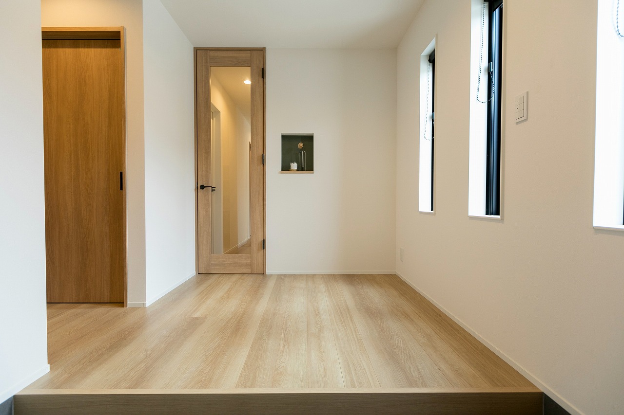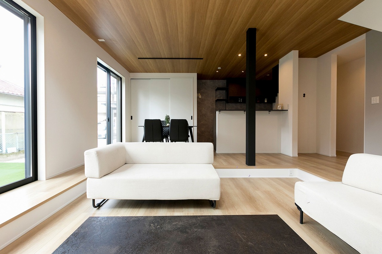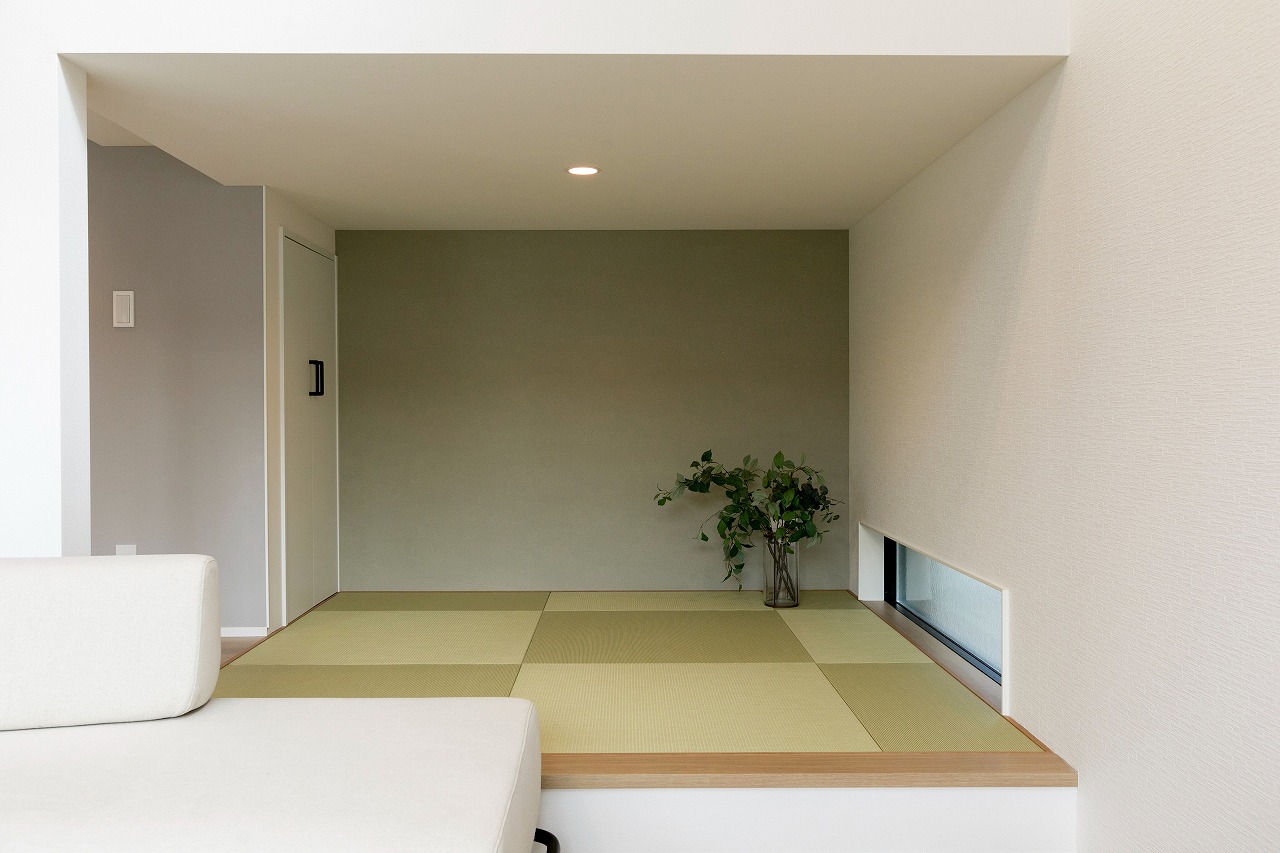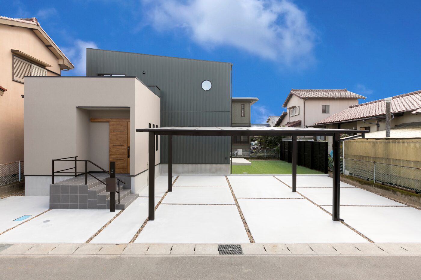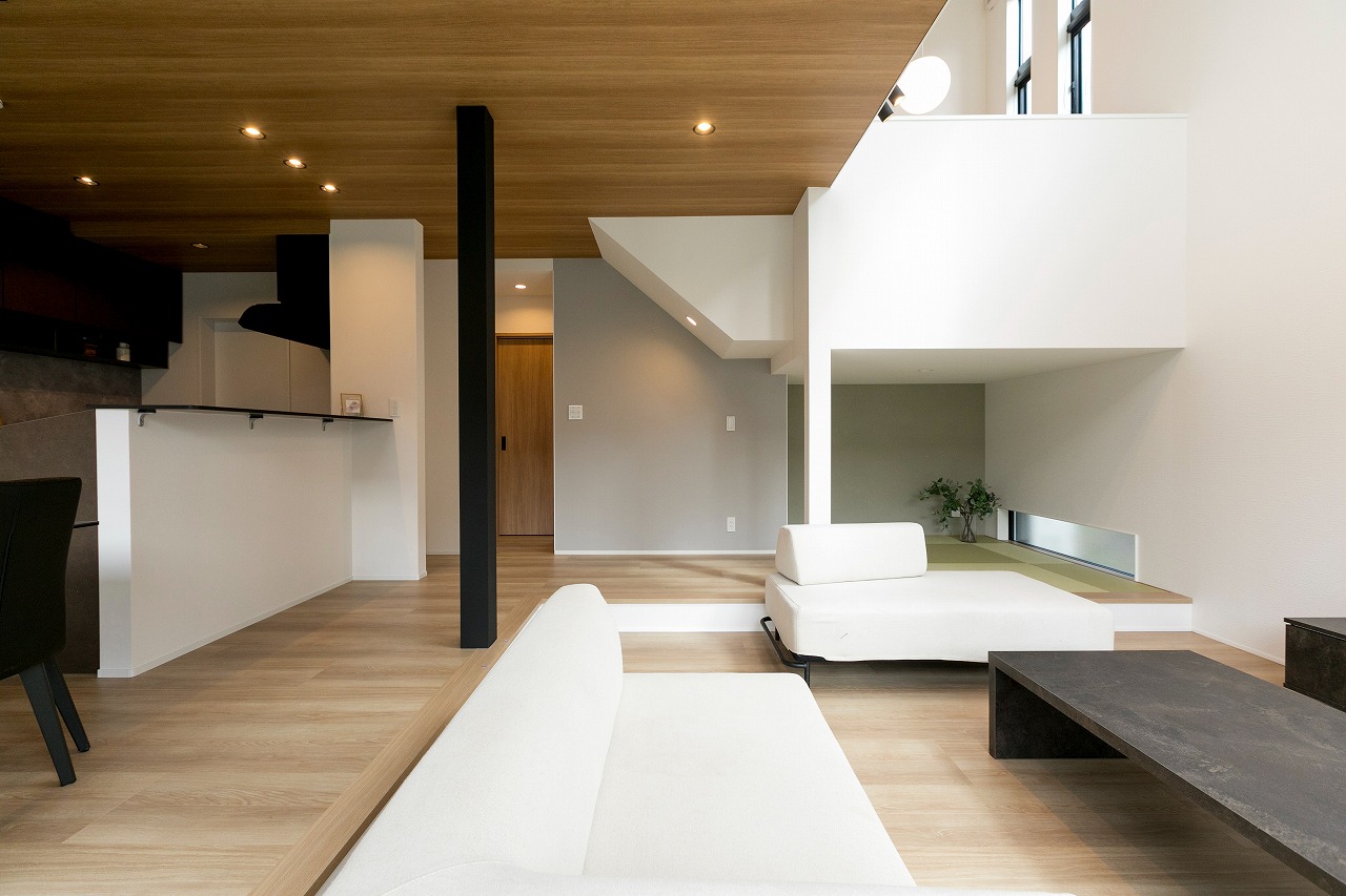 注文住宅 ピットリビングの和モダンハウス 弥富市K様邸 Exterior 塗壁×金属サイディングの外壁を使用。木目調の玄関ドアと丸窓がアクセントの和モダンな外観に仕上がりました! Living ピットリビングと吹抜け大きなテラス窓が解放感たっぷり Japanese Room スキップフロアの下にはこもり感のある和室スペース Kitchen 重厚感のあるブラウンで天板まで統一されたキッチン Laundry お洗濯から収納まで完結するランドリースペース Restroom Walk-in Closet Entrance 一覧へ 前へ 次へ
