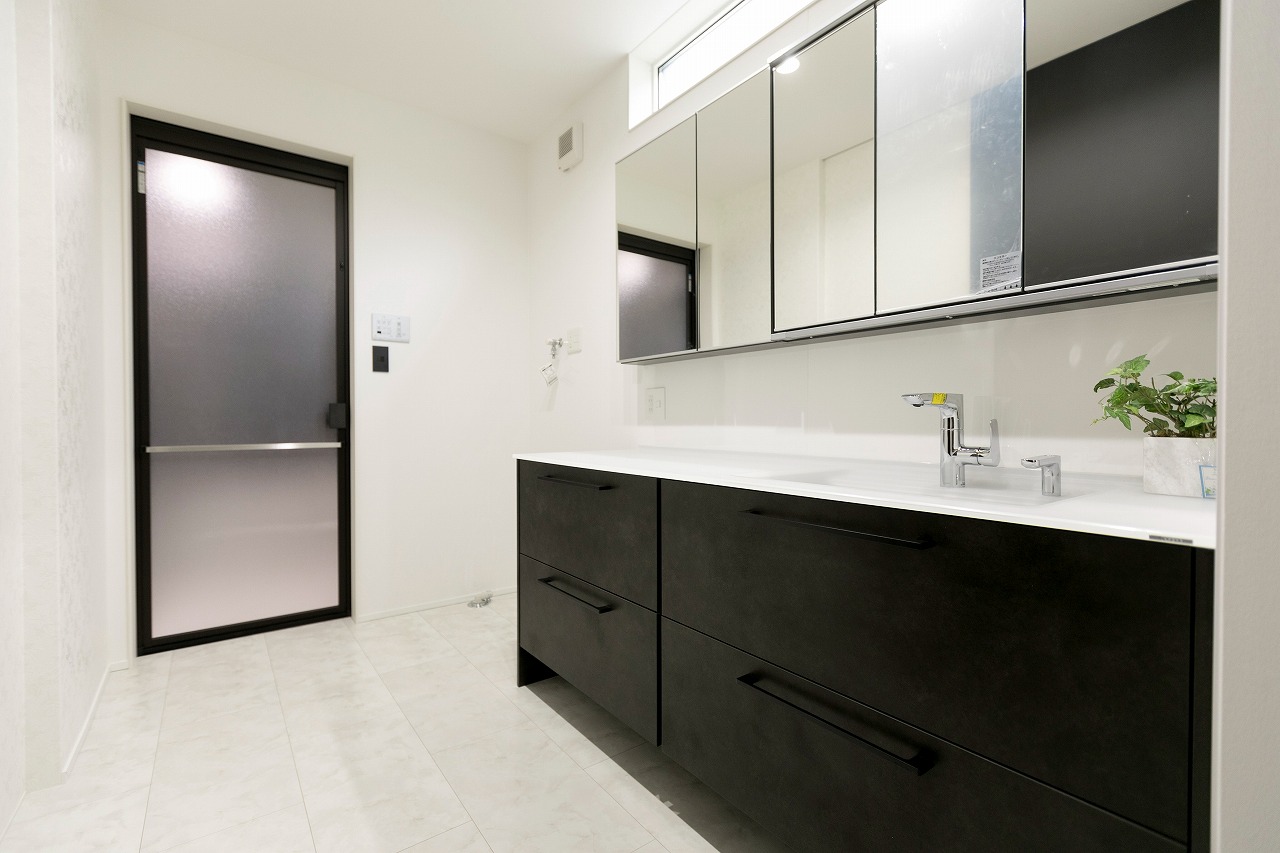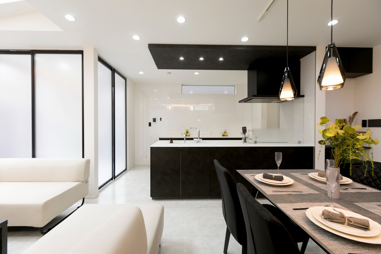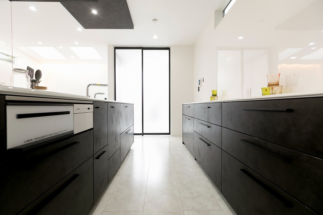 注文住宅 ホテルライクなモノトーンハウス 名古屋市K様邸 Exterior 外観から内観まで全てモノトーンでまとめたK様邸。北側玄関の為極力窓を少なくシンプルに、サイディングの貼り分けで、かっこよく仕上がりました! Dining & Living 天窓が二つ並んだ明るいリビング Kitchen TOTOのペニンシュラ型キッチンもモノトーンでキリっと Laundry キッチンとお揃いの洗面化粧台は機能性も抜群! Restroom Walk-in Closet Bedroom 主寝室の隣にはかっこいい男の書斎スペース 一覧へ 前へ 次へ