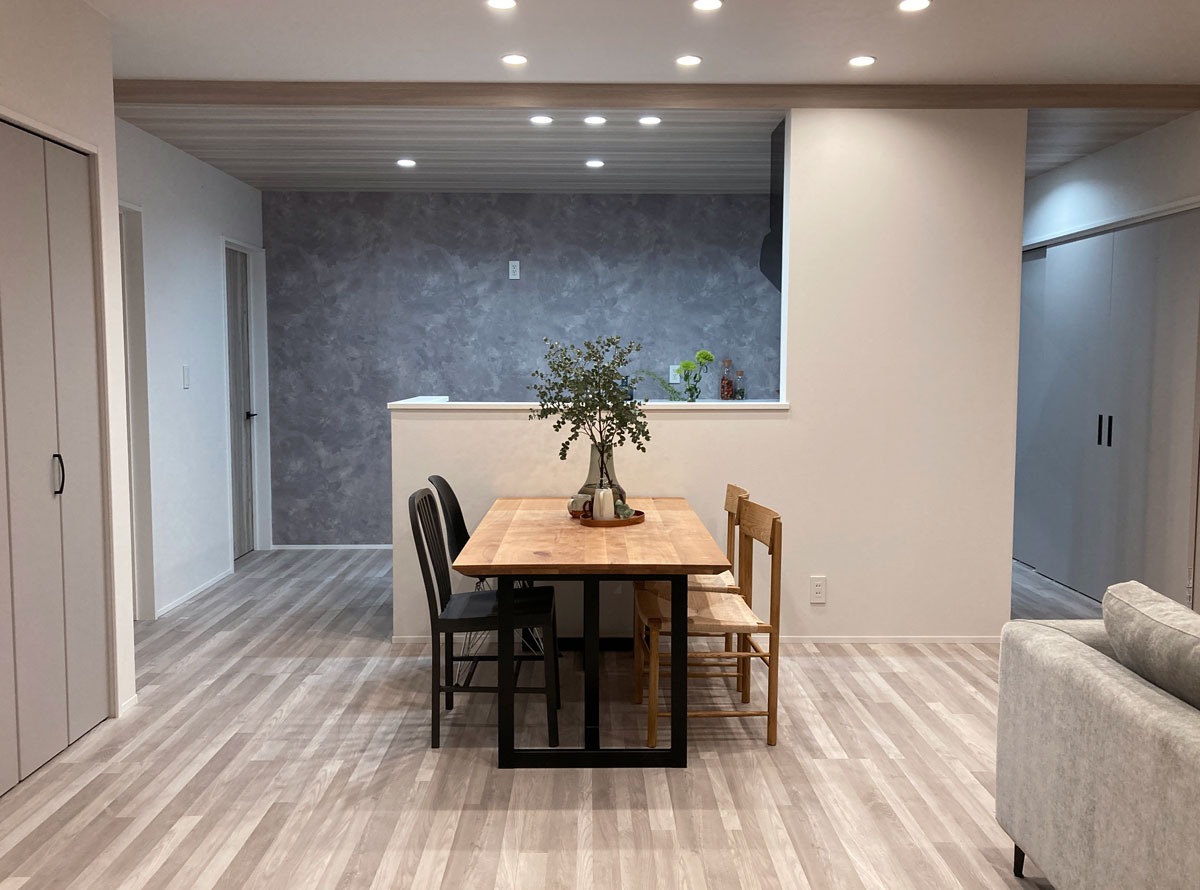 壁を取り払い、リビングルーム、ダイニングエリア、キッチンを一体化させることで、開放感のある広々とした空間を実現。