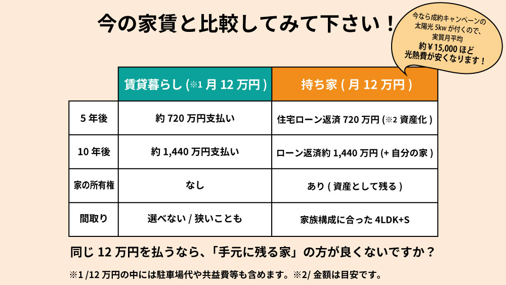 でもこのモデルハウスなら、月々の支払いが家賃と同じくらいで、ちゃんと“自分の資産”になります。