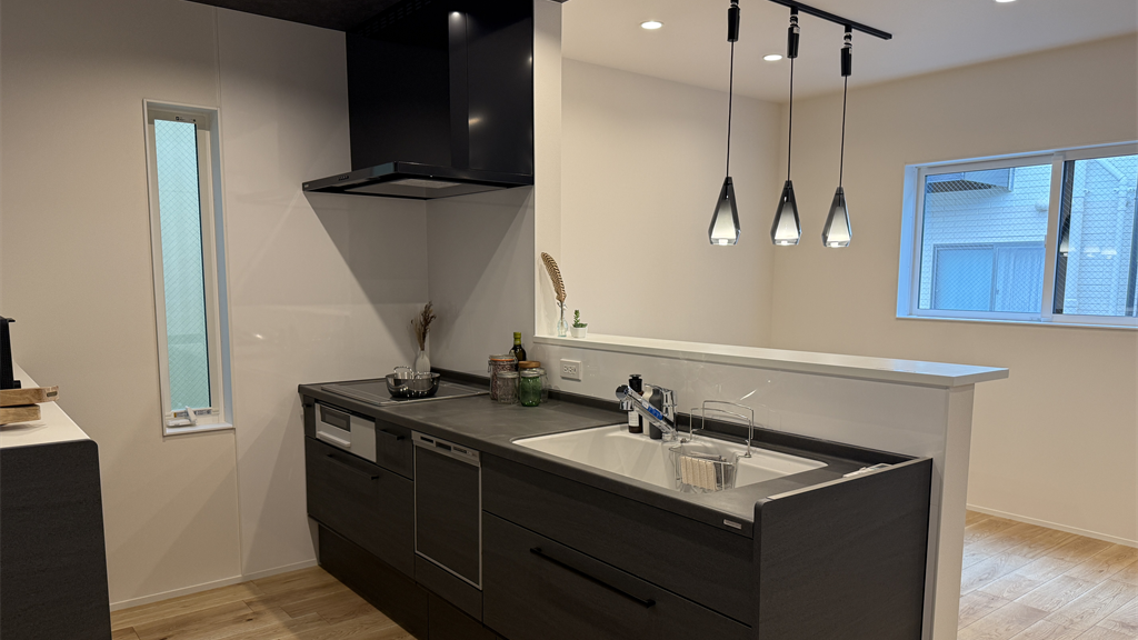 4)カッコよく仕上げた収納力も抜群のキッチン空間