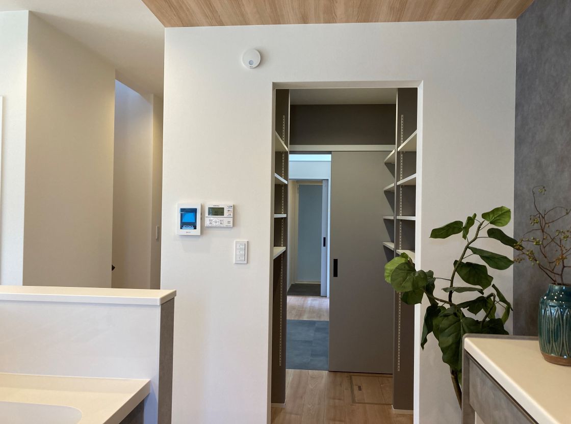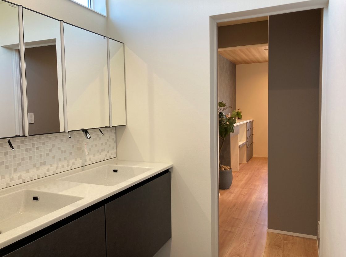 キッチンからUBまでを横移動でつなぐ”ママ神動線”。東西に長い敷地を活かし北側に集約できることで視線も気にせず家事が可能。さらに、洗う⇔干す⇔しまうを5歩以内で完結できてしまう家事ラク動線です。
