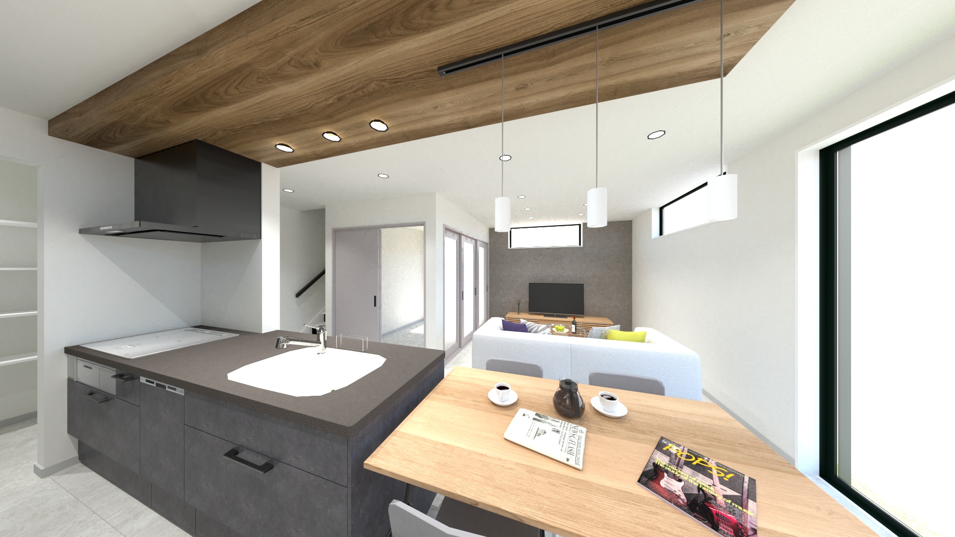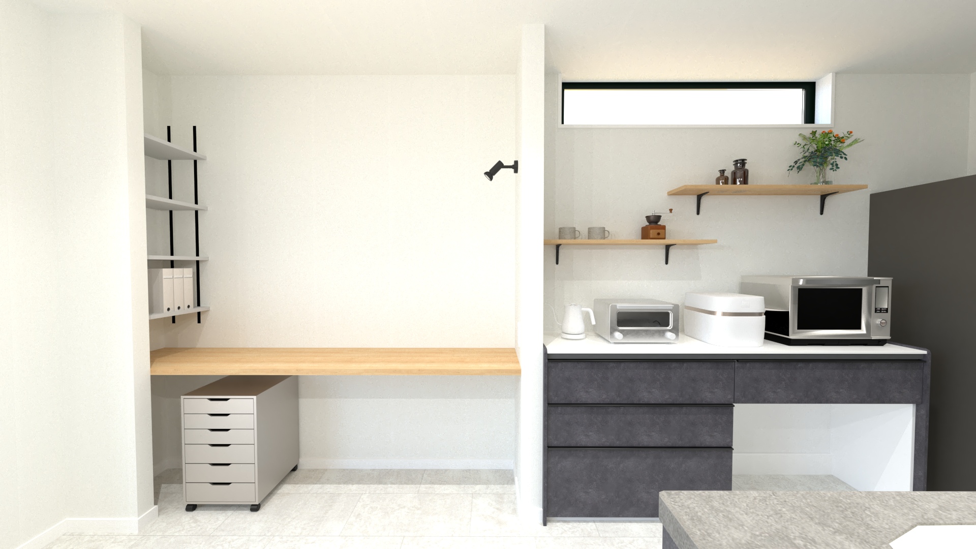 キッチン横カウンターと、書類や小物をまとめて収納できる専用スペースで、LDKが自然と片付く工夫を。リビング横の扉で仕切れるフリースペースは、キッズスペースにも最適です。