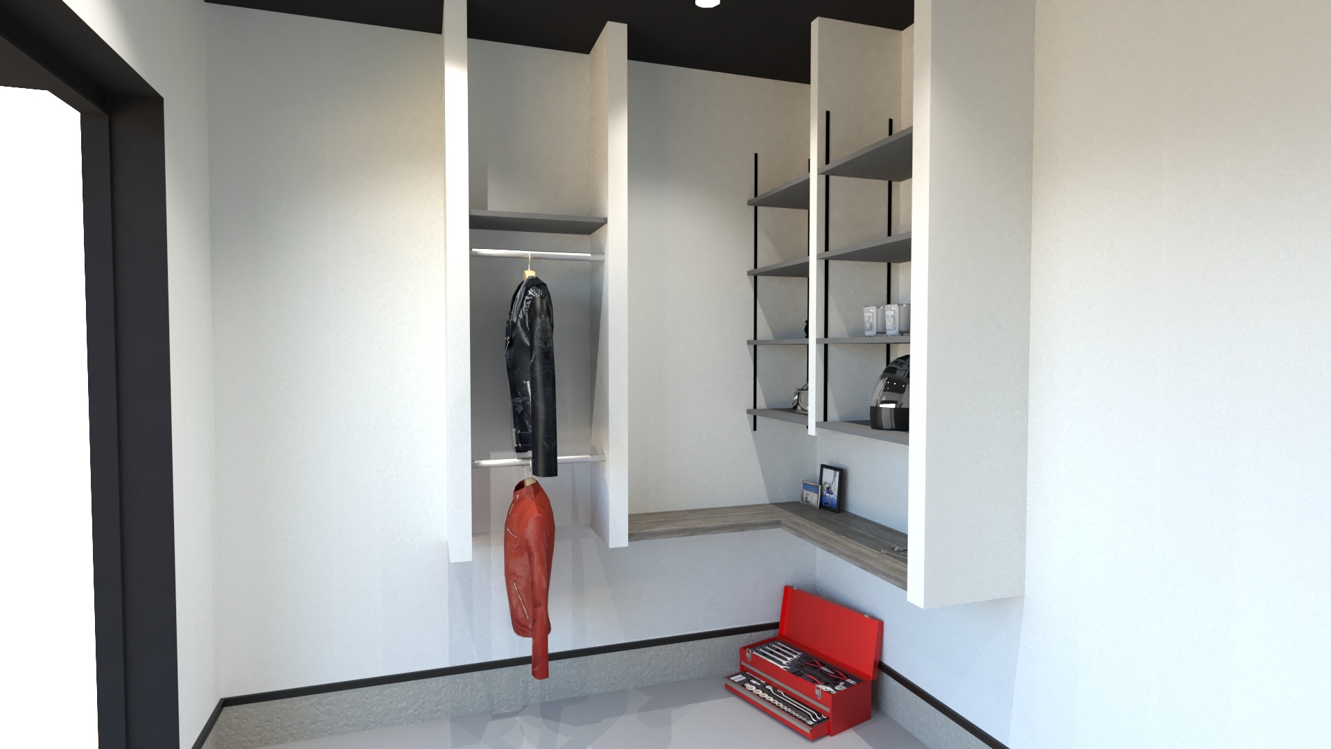 ヘルメットやライダースジャケット、工具類まで「趣味を楽しみながら美しく収納」できる空間です。