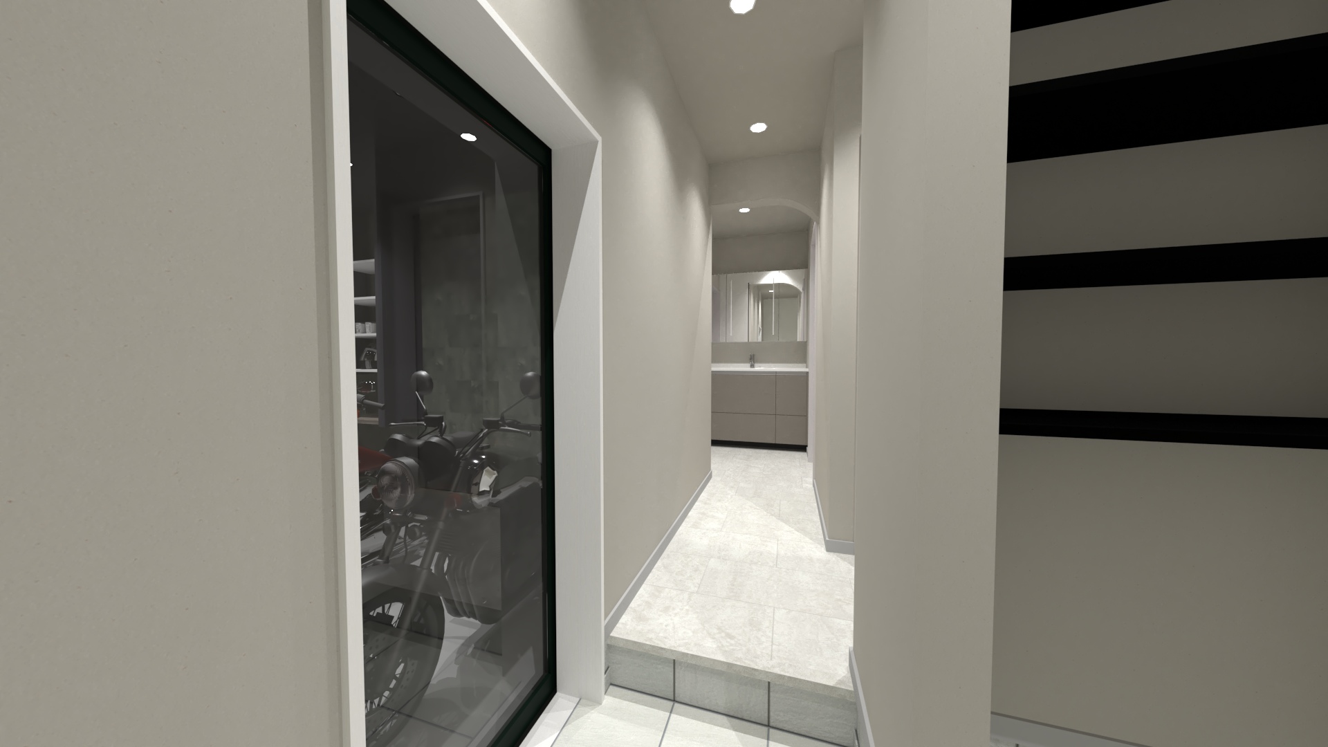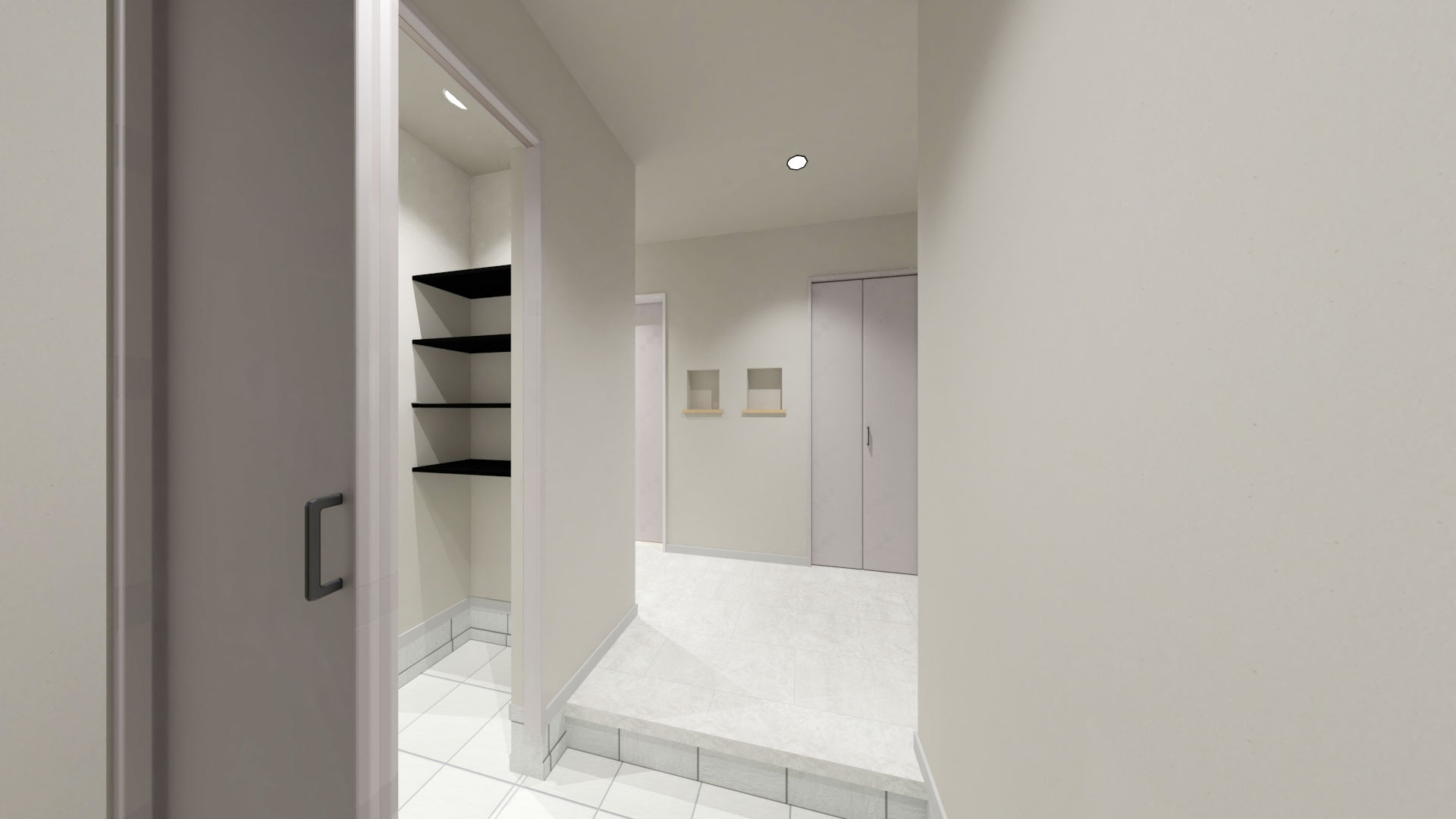 玄関を起点に「バイクガレージ」「洗面脱衣室」へつながる快適動線。