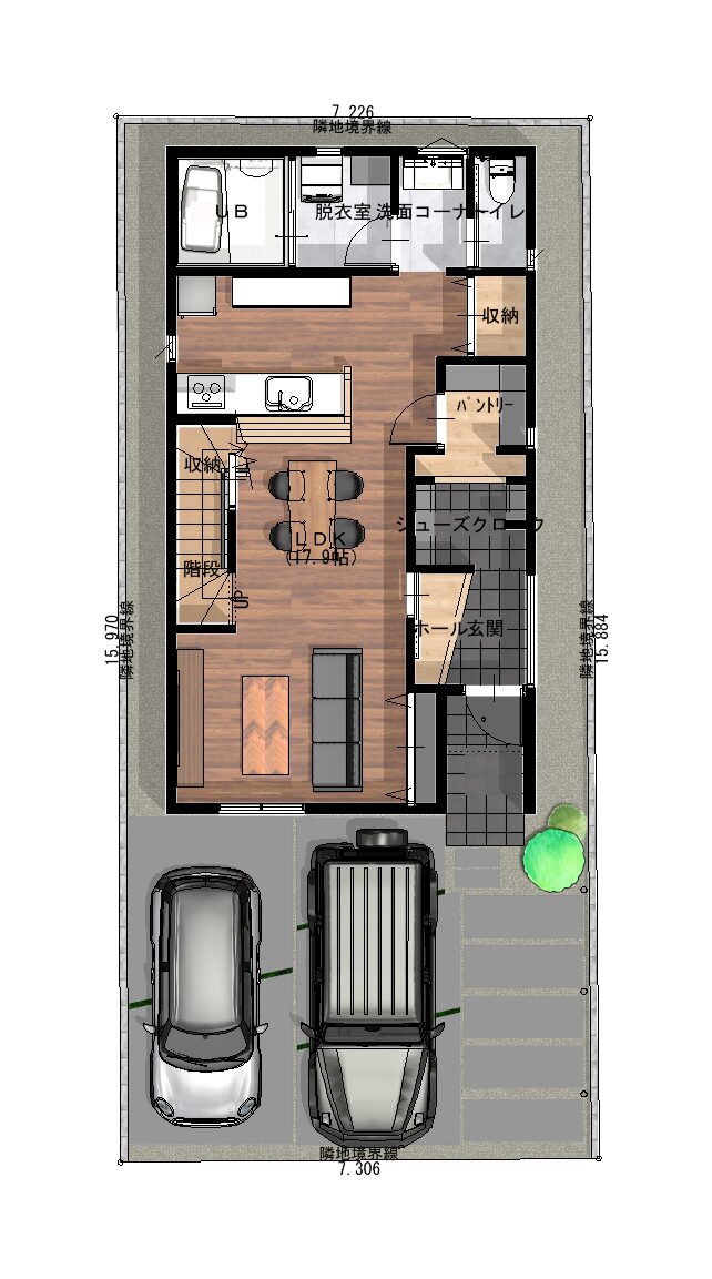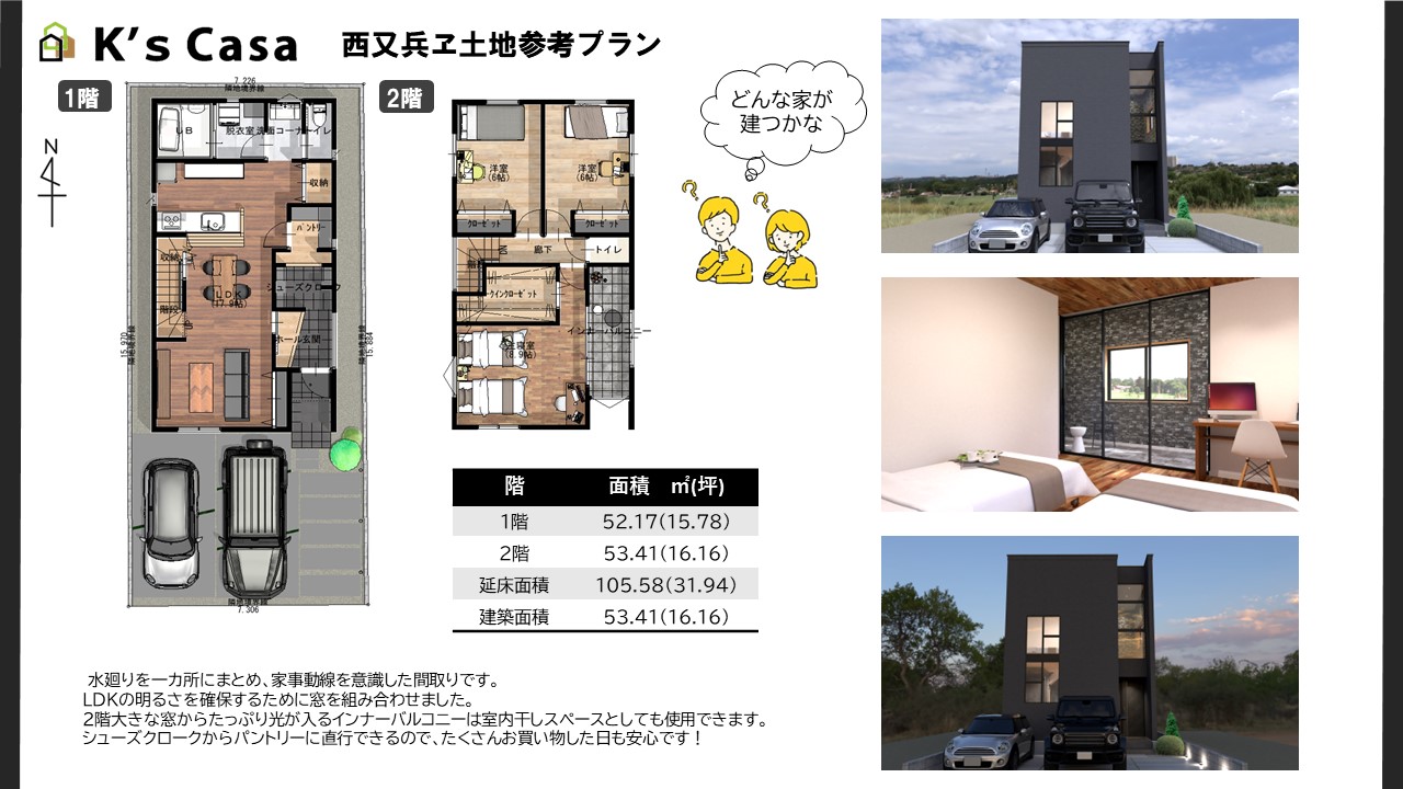 南側が間口の為、陽当たりの良い間取りが可能で、車は2台、ゆったり広さのある吹抜けリビングや外干に苦手でインナーバルコニーを希望の方などのご要望にも対応可能な土地となっています。