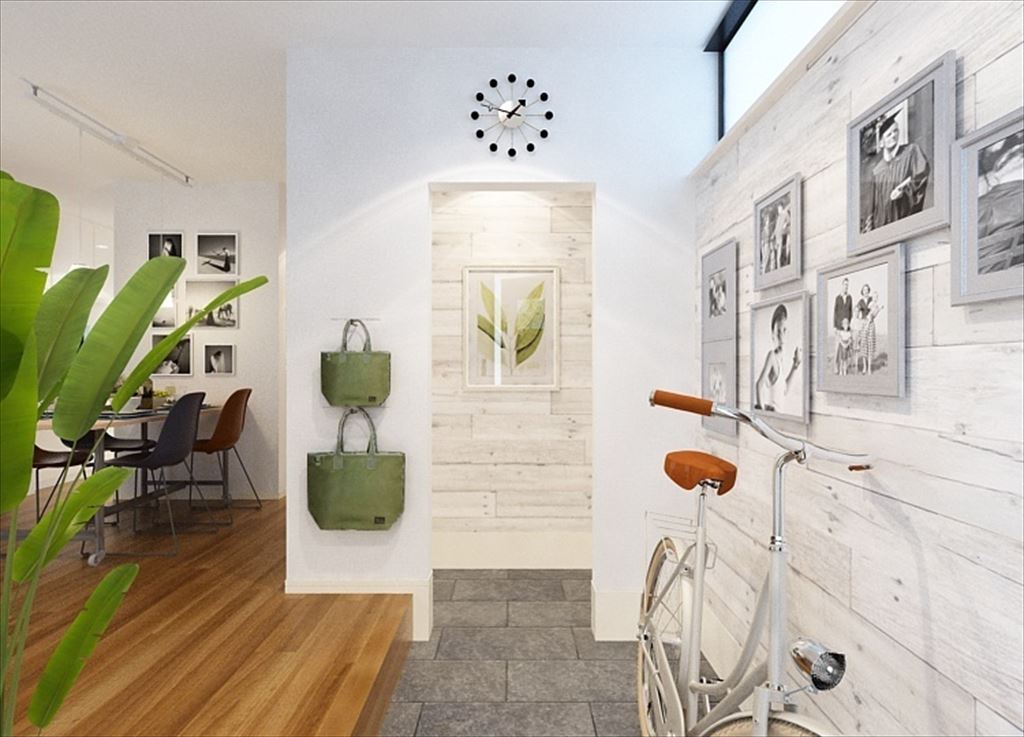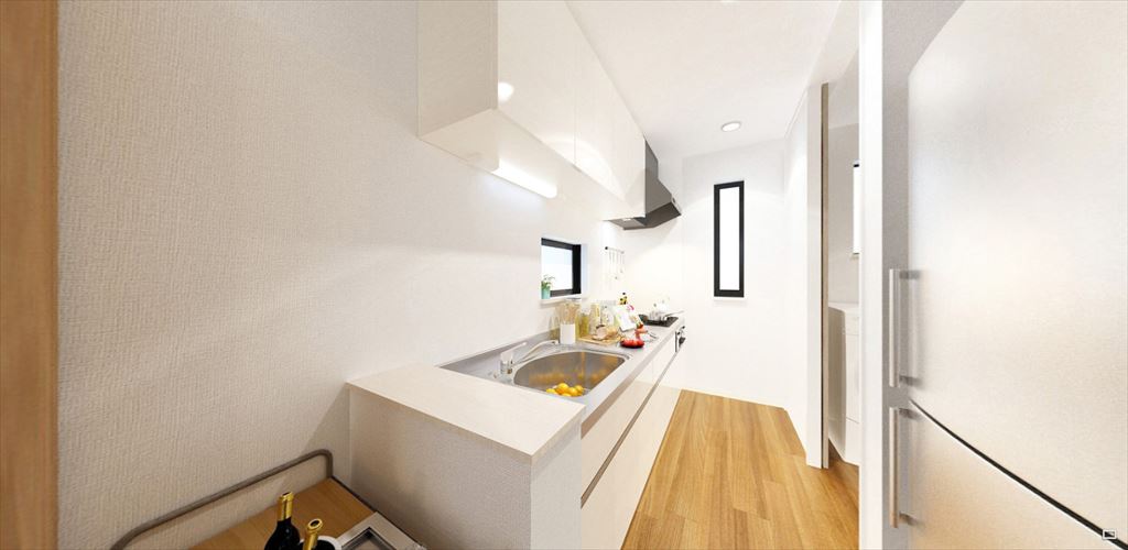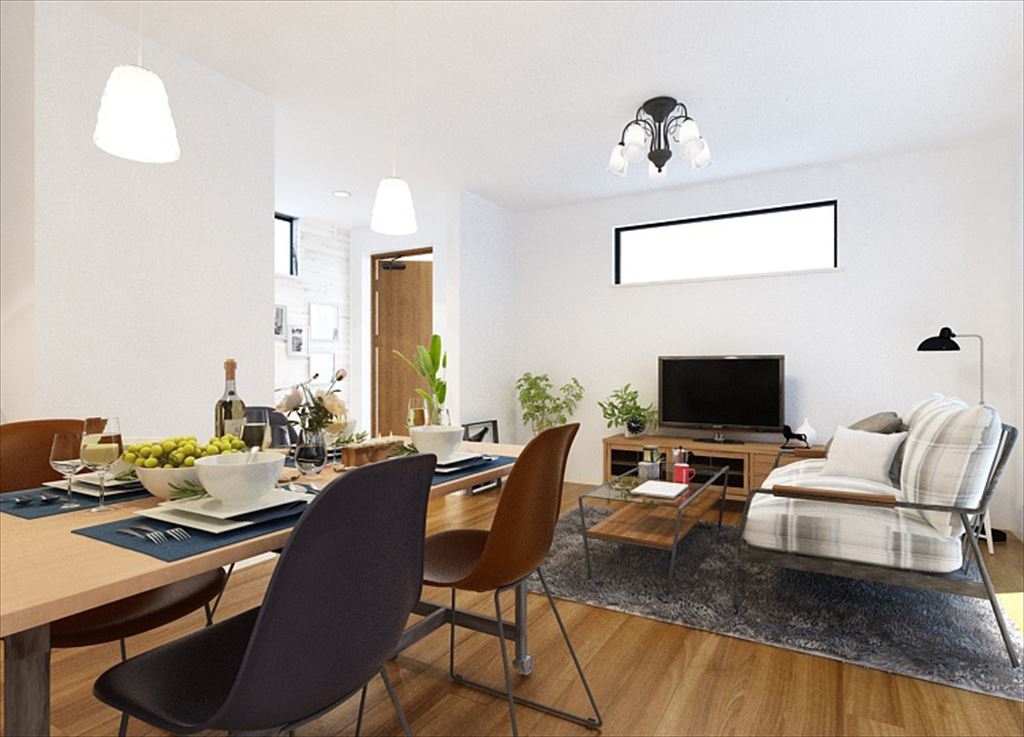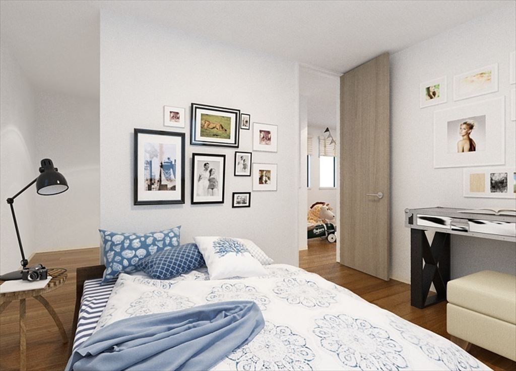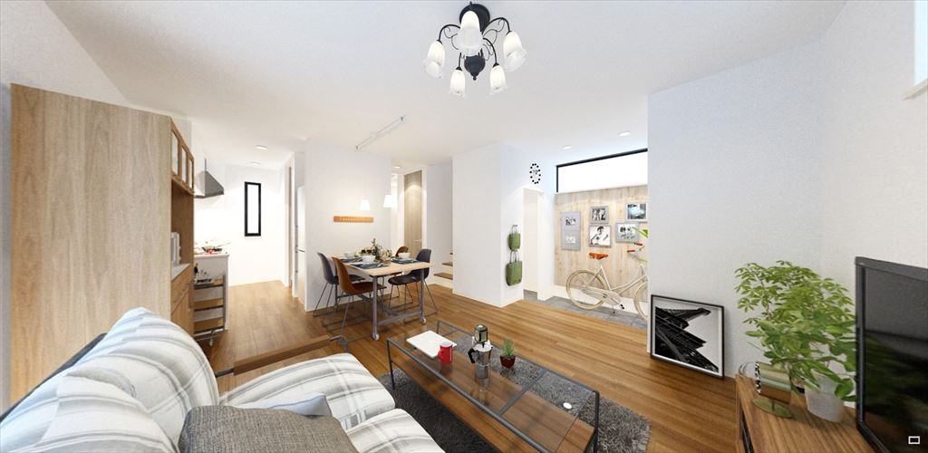 広々した玄関・リビング・ダイニングと、家事の動線を考えた機能空間が特徴的な68。1階の水まわりはキッチンからお風呂、洗面台まで一塊にまとめられ、洗濯や料理、掃除をしやすく。2階のフリースペースは家族の変化に合わせ、本棚を置いてみんなの図書館にしたり、オプションで部屋に変更することもできます。主寝室には大きなウォークインクローゼットがストレージの役割を果たします。