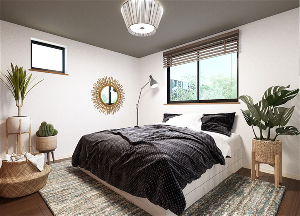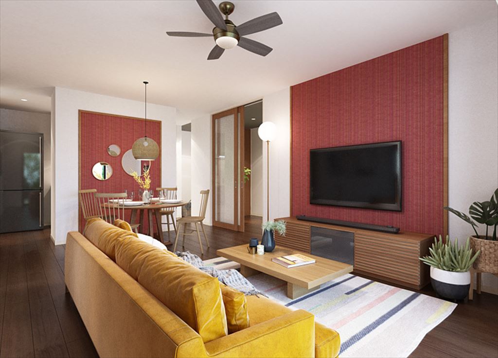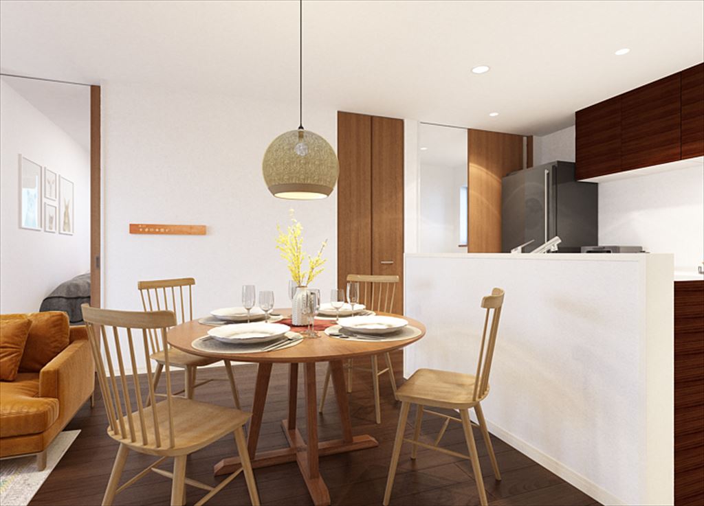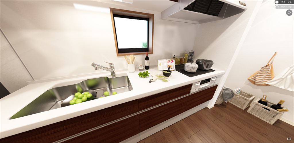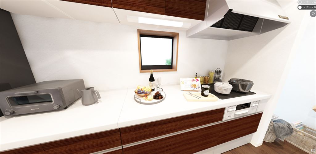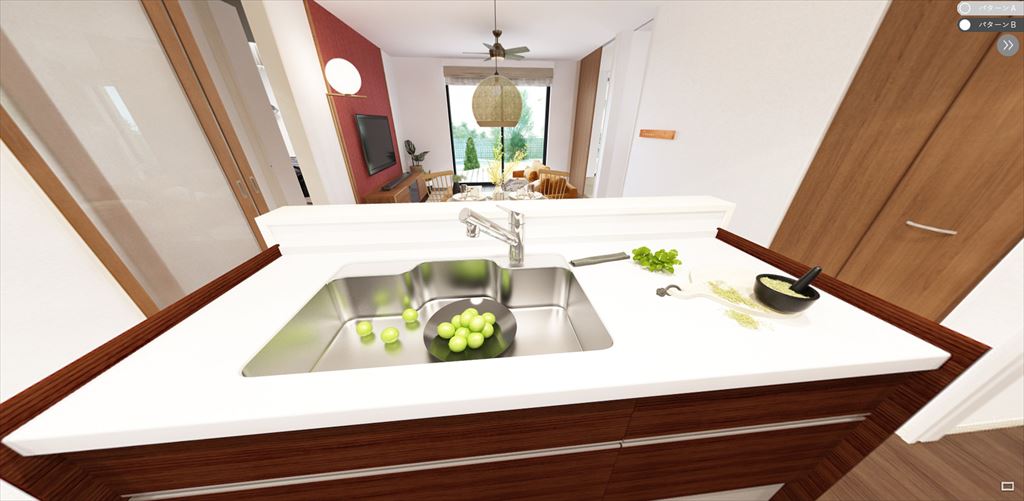 平屋の3LDKプランである1210は、広めの土地を想定したゆったりなつくり。リビングとバルコニーを繋ぐ大きな掃き出し窓から外に出ると、ダウンライトを埋め込んだ屋根があり、半野外空間として利用できます。VRのBタイプでは、キッチンに立つとリビング越しに広がる庭が望めます。リビングで必ず家族が顔を合わせるような部屋構成となっていて、自然とフラットな会話が生まれます。