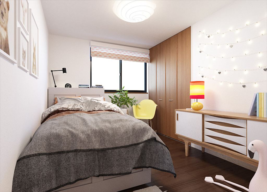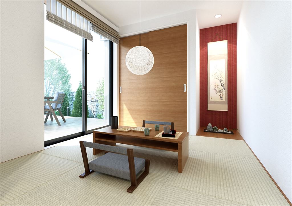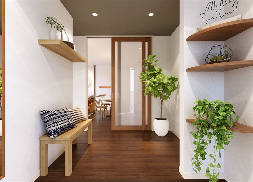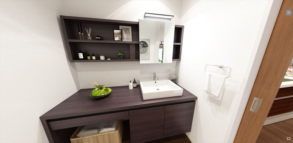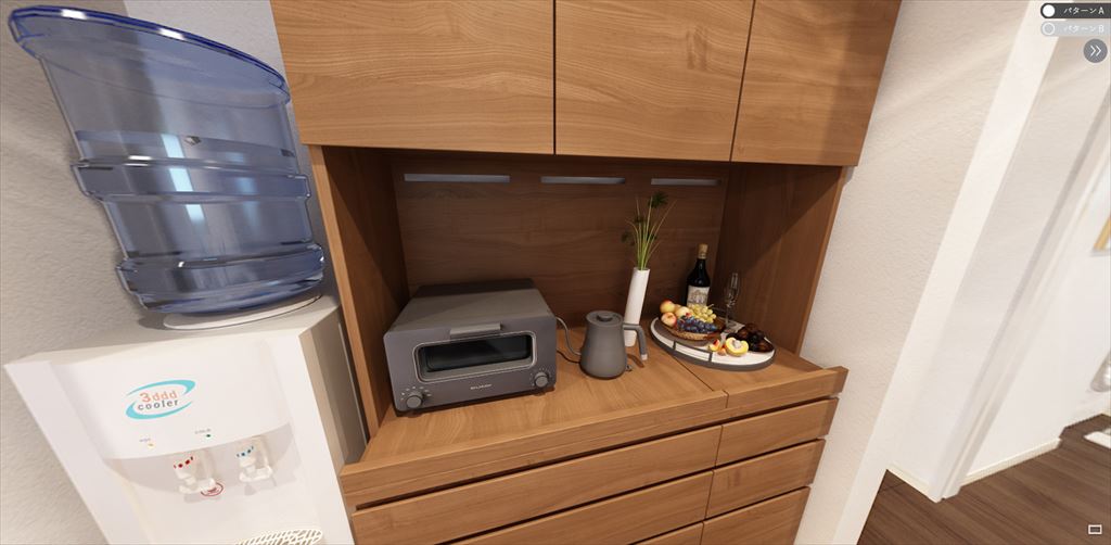 平屋の3LDKプランである1210は、広めの土地を想定したゆったりなつくり。リビングとバルコニーを繋ぐ大きな掃き出し窓から外に出ると、ダウンライトを埋め込んだ屋根があり、半野外空間として利用できます。VRのBタイプでは、キッチンに立つとリビング越しに広がる庭が望めます。リビングで必ず家族が顔を合わせるような部屋構成となっていて、自然とフラットな会話が生まれます。
