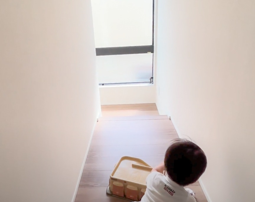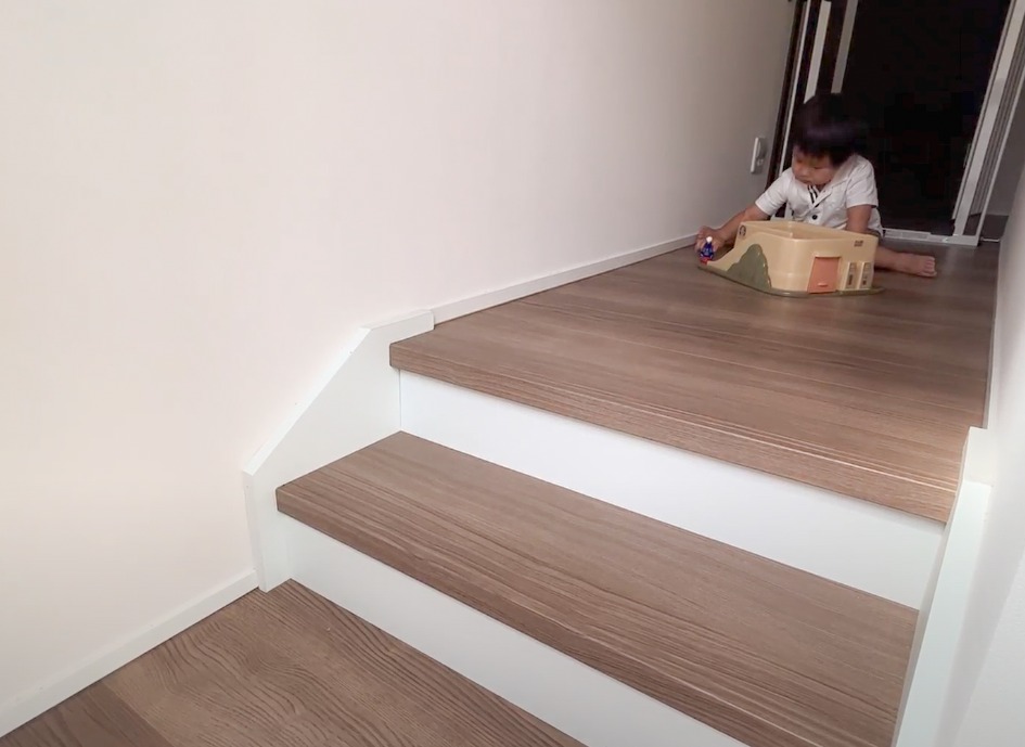 踊り場の窓から外を見たり、窓辺で電車のおもちゃを走らせたりと、もちろん目を離すことはできませんが、階段の上り下りの練習にもなり、とっておきの空間になりました。