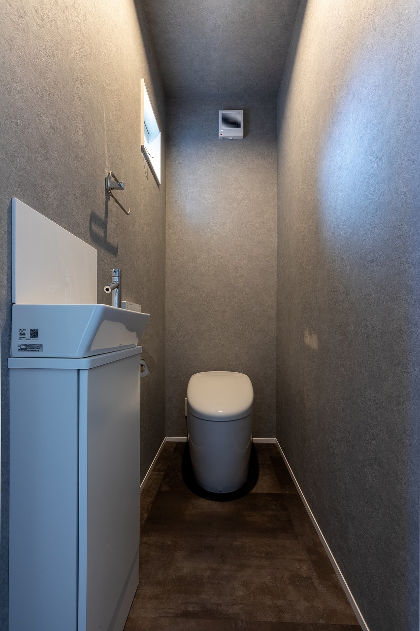 ほぼ自分たちしか使わない2階のトイレとは違って、1階のトイレはよりかっこよくしたかったので、壁紙も床もこだわりました。